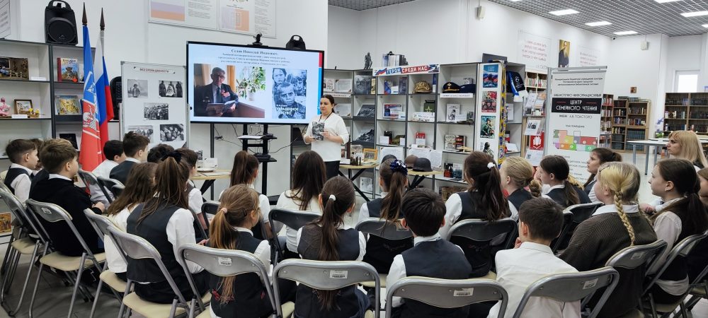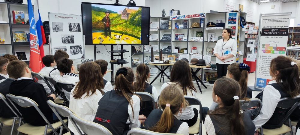 В завершение мероприятия школьники посмотрели мультфильм «Два детства», созданный в рамках патриотической мультстудии «Zа Мир» читателями детской библиотеки имени К.И. Чуковского, по одноимённому стихотворению Седова Николая Ивановича.