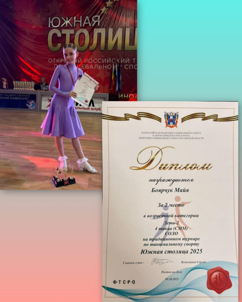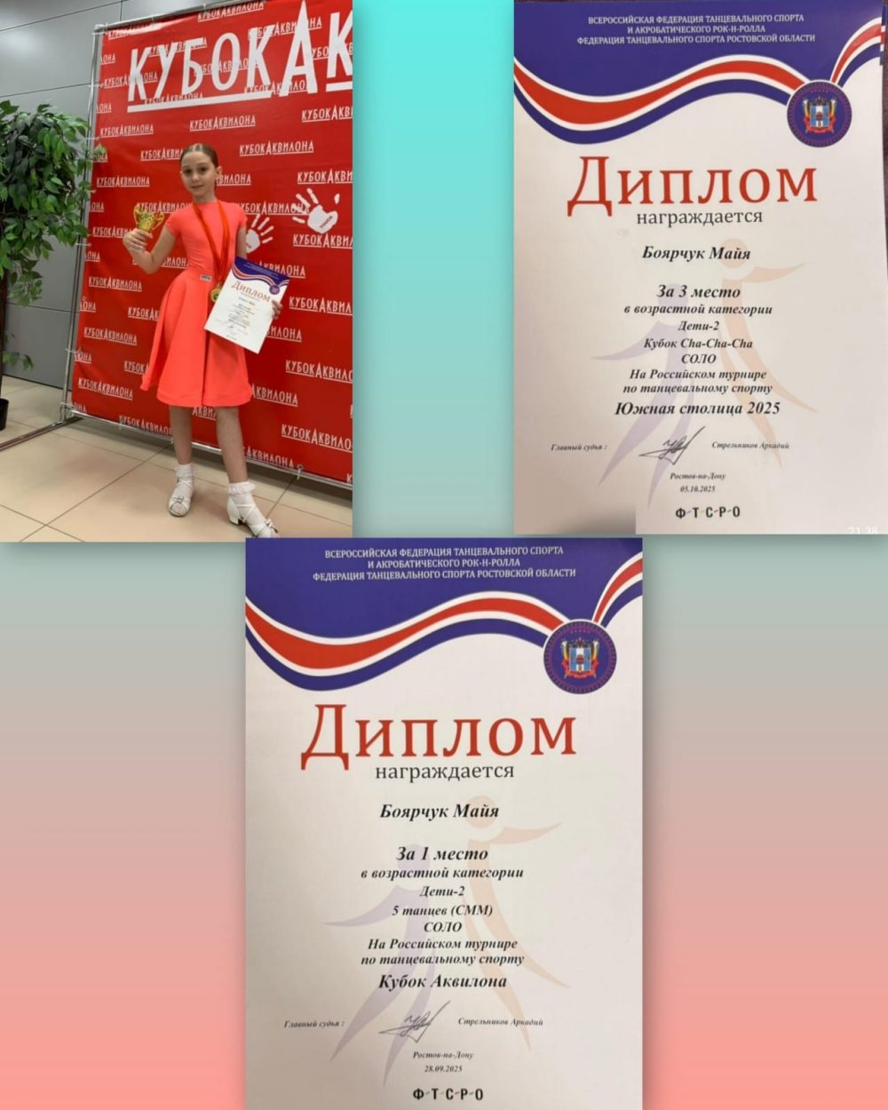 Майя Баярчук, увлечённая спортивными бальными танцами, уже успела продемонстрировать свои достижения. На На Российском турнире по танцевальному спорту Южная столица 2025 и Кубок Аквилона Майя завоевала первое место в возрастной категории 5 танцев (СММ) Соло, второе место в категории 4 танца (СММ) Соло и третье место в категории Кубок Cha-cha-cha Соло.