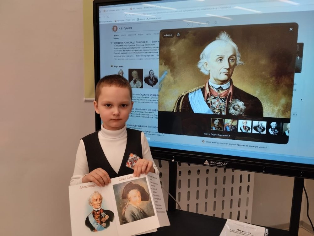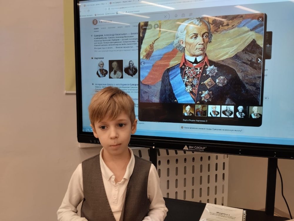 На классном часе в рамках проекта историческая параллель ученики 1 «А» класса #ШТИ74 — Вусик Тимур и Бонта Артём — представили своим сверстникам увлекательную презентацию о великом генералиссимусе. Ребята рассказали о главных событиях биографии Александра Васильевича, от первых шагов юного офицера до блестящих военных кампаний, завершившихся триумфальными победами над врагами Отечества.
