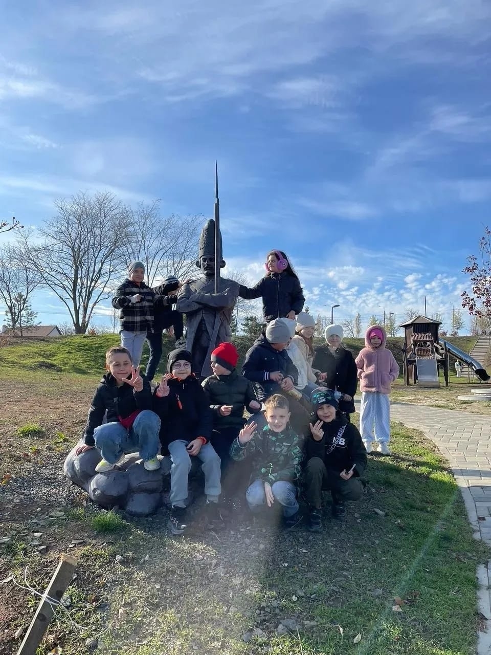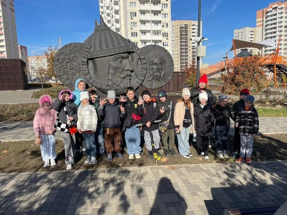 Основными объектами экскурсионного маршрута были: центральная аллея, украшенная тематическими композициями и памятниками героям войны, стела Героев Отечества и множество скульптурных композиций-стальные пилоны с различными изображениями и историческими датами. Прекрасным местом стала удобная зона отдыха, где дети смогли перекусить, отдохнуть и поиграть.